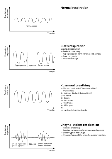 Abnormal breathing patterns include Kussmaul breathing, Biot's respiration and Cheyne–Stokes respiration.
