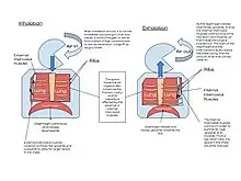 The lungs are not capable of inflating themselves, and will expand only when there is an increase in the volume of the thoracic cavity.[6][7] In humans, as in the other mammals, this is achieved primarily through the contraction of the diaphragm, but also by the contraction of the intercostal muscles which pull the rib cage upwards and outwards as shown in the diagrams on the right.[8] During forceful inhalation (Figure on the right) the accessory muscles of inhalation, which connect the ribs and sternum to the cervical vertebrae and base of the skull, in many cases through an intermediary attachment to the clavicles, exaggerate the pump handle and bucket handle movements (see illustrations on the left), bringing about a greater change in the volume of the chest cavity.[8] During exhalation (breathing out), at rest, all the muscles of inhalation relax, returning the chest and abdomen to a position called the "resting position", which is determined by their anatomical elasticity.[8] At this point the lungs contain the functional residual capacity of air, which, in the adult human, has a volume of about 2.5–3.0 liters.[8]