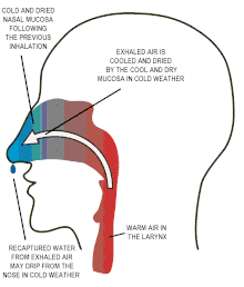Ideally, air is breathed first out and secondly in through the nose.[9] The nasal cavities (between the nostrils and the pharynx) are quite narrow, firstly by being divided in two by the nasal septum, and secondly by lateral walls that have several longitudinal folds, or shelves, called nasal conchae,[10] thus exposing a large area of nasal mucous membrane to the air as it is inhaled (and exhaled). This causes the inhaled air to take up moisture from the wet mucus, and warmth from the underlying blood vessels, so that the air is very nearly saturated with water vapor and is at almost body temperature by the time it reaches the larynx.[8] Part of this moisture and heat is recaptured as the exhaled air moves out over the partially dried-out, cooled mucus in the nasal passages, during exhalation. The sticky mucus also traps much of the particulate matter that is breathed in, preventing it from reaching the lungs.[8][10]