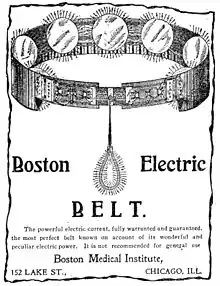 Pulvermacher patented the chain battery in the US in 1853. This was soon followed by the wearable chain battery belt, or electric belt. Electric belts became enormously popular in the US, far more so than in Europe. This led to the company headquarters being moved to Cincinnati by the 1880s as the Pulvermacher Galvanic Company, but still calling themselves Pulvermacher's of London for the prestige of a European connection. Early models had to be soaked in vinegar before use as in England, but later on models that worked purely by galvanic action with body sweat were introduced. Since the device was being sold essentially as a quack cure it was only necessary to generate enough electricity that the wearer could feel it, no matter how slightly, and know that it was working.[21]