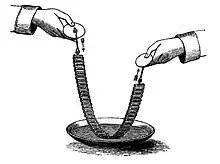 Despite this inauspicious start with the medical profession, the Pulvermacher chain continued to be described in scientific and medical journals and books as a useful tool throughout the late 1850s and 1860s, even being mentioned in the proceedings of the Royal Society.[18] Even Bird, at the height of his dispute with the Pulvermacher company found himself able to say "the battery of Pulvermacher is an ingenious and useful source of electricity..."[16] Although banned from much of the medical press, the Pulvermacher Company did not restrain its advertising claims or its use of notable names.[19] The College of Dentists investigated its possible use as an anaesthetic during tooth extraction but found no benefit with the device frequently adding to the pain.[20] In 1869, the Pulvermacher Company again found itself the subject of discussion in the medical press when they were involved in legal proceedings. This time the company was itself the victim of quacks when its product was pirated with poor quality imitations and this was the cause of the court case. The Medical Times was prompted by this to examine the efficacy of the Pulvermacher chain ending a long period of the paper ignoring it as a worthless quack instrument. The result was a very positive review of the chain's function and the reviewer particularly praised the workmanship.[10]