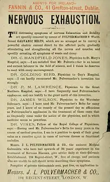 - ↑ Example Pulvermacher advertisement Christian Witness and Congregational Magazine, vol.16 (1859), p.16, London: John Snow 1859.