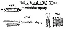 Each cell consisted of a wooden dowel with a bifilar winding of copper and zinc wires. The dowels were helically grooved like a screw thread to locate the wires precisely in position. This enabled the copper and zinc wires to be placed very close to each other without coming into electrical contact. Insulated wires could not be used as this would interfere with the operation of the electrolyte. Copper wires were inserted into the ends of the dowels to which the copper and zinc windings were soldered. These end wires were either attached to, or formed into, hooks and eyes for attaching to other cells. This arrangement is depicted in figure 2. These attachments provided the electrical connections as well as the mechanical linkages.[2]