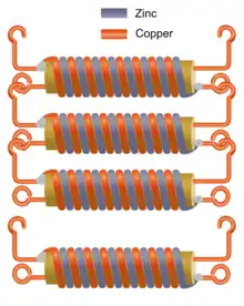 Each cell was connected to the next with the copper winding of one being connected to the zinc winding of the next and so on. The cells could be connected end-to-end, or for a more compact assembly side-by-side, in the manner of links in a chain. The voltage delivered by the assembly was controlled by the number of links thus incorporated and could become quite high, even though the current available was no more than from a single cell (to increase the current, the size of the cells must be increased). The shock delivered by such chains was described as "strong" for one chain of 120 links, and as "sharp" for another of 50 links.[3]