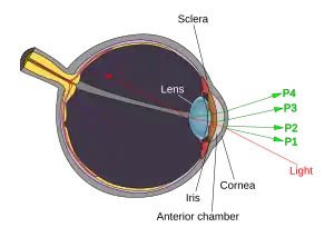 Purkinje images are reflections of objects from the structure of the eye. They are also known as Purkinje reflexes and as Purkinje–Sanson images. At least four Purkinje images are usually visible in the normal eye. The first Purkinje image (P1) is the reflection from the outer surface of the cornea. The second Purkinje image (P2) is the reflection from the inner surface of the cornea. The third Purkinje image (P3) is the reflection from the outer (anterior) surface of the lens. The fourth Purkinje image (P4) is the reflection from the inner (posterior) surface of the lens. Unlike the others, P4 is an inverted image.