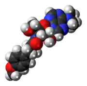 Puromycin is an aminonucleoside antibiotic, derived from the Streptomyces alboniger bacterium,[1] that causes premature chain termination during translation taking place in the ribosome. Part of the molecule resembles the 3' end of the aminoacylated tRNA. It enters the A site and transfers to the growing chain, causing the formation of a puromycylated nascent chain and premature chain release.[2] The exact mechanism of action is unknown at this time but the 3' position contains an amide linkage instead of the normal ester linkage of tRNA. That makes the molecule much more resistant to hydrolysis and stops the ribosome.