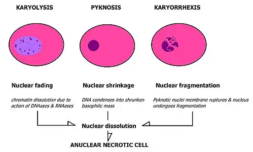 Pyknosis, or the irreversible nuclear condensation (a nuclear morphology) in a cell (generally old vertebrate leukocyte cells) is the result of a cell undergoing either apoptosis or necrosis.[3] There are two types of pyknosis: nucleolytic pyknosis and anucleolytic pyknosis. Nucleolytic pyknosis occurs during apoptosis (a form of controlled/programmed cell death), while anucleolytic pyknosis occurs during necrosis.[4] Necrosis is a form of regulated cell death due to toxins, infections, and other acute stressors.[4] These stressors cause swelling/shape modification of cellular organelles leading to the eventual loss of stability and integrity of the cell membrane.[4]