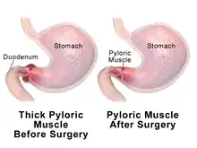 - ↑ Oomen MW, Hoekstra LT, Bakx R, Ubbink DT, Heij HA (August 2012). "Open versus laparoscopic pyloromyotomy for hypertrophic pyloric stenosis: a systematic review and meta-analysis focusing on major complications". Surgical Endoscopy. 26 (8): 2104–2110. doi:10.1007/s00464-012-2174-y. PMC 3392506. PMID 22350232.