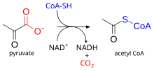 Pyruvate + NAD+ + CoA → Acetyl-CoA + NADH + CO2