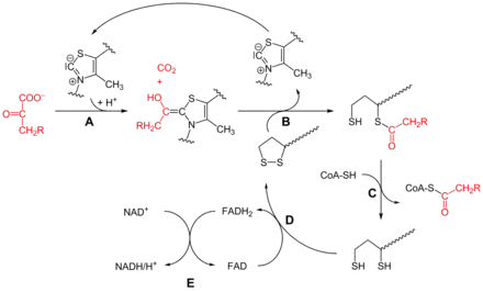 - ↑ Patel MS, Nemeria NS, Furey W, Jordan F (2014). "The pyruvate dehydrogenase complexes: structure-based function and regulation". The Journal of Biological Chemistry. 289 (24): 16615–16623. doi:10.1074/jbc.R114.563148. PMC 4059105. PMID 24798336.