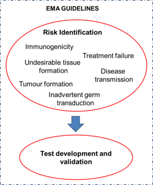 When quality control of TEMPs is considered, a risk assessment needs to be conducted. A risk is defined as a "potentially unfavourable effect that can be attributed to the clinical use of advanced therapy medicinal products (ATMPs) and is of concern to the patient and/or to other populations (e.g. caregivers and off-spring)".[3] Some risks include immunogenicity, disease transmission, tumor formation, treatment failure, undesirable tissue formation, and inadvertent germ transduction. A risk factor is defined as a "qualitative or quantitative characteristic that contributes to a specific risk following handling and/or administration of an ATMP".[3] The integration of all available information on risks and risk factors is called risk profiling. Due to the fact that every TEMP is different, the risks associated with each one of them vary and, subsequently, the procedures that must be implemented to ensure its quality are also unique to the product. Once the risks associated with the TEMP are identified, the appropriate tests must be developed and validated accordingly. Thus, there is no standard set of tests for the quality control of TEMPs. The EMA has released a set of regulatory guidelines on the topics to be considered by companies involved in the development and marketing of medicines for use in the European Union.[3][4][5][6] These guidelines have to be followed in order for the marketing authorization of a product to be issued. Fictitious examples of risk analysis for further elucidation of the process are provided in the EMA guidelines.[3]