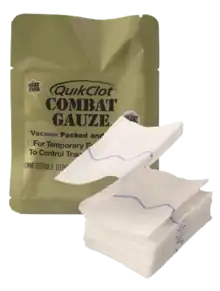 QuikClot is a brand of hemostatic wound dressing that contains an agent that promotes blood clotting. The brand is owned by Teleflex.[1] It is primarily used by militaries and law enforcement to treat hemorrhaging from trauma.