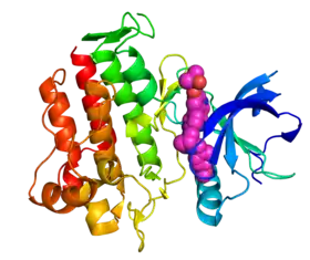 ![]() Selpercatinib inhibitor (magenta spheres) complexed with RET kinase (rainbow colored) | |