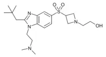RQ-00202730 is a benzimidazole derived drug that acts as a potent and highly selective agonist for the CB2 cannabinoid receptor, with a Ki value of 19nM at CB2 and more than 4000x selectivity over CB1, though it also shows some activity as an antagonist of the unrelated 5-HT2B serotonin receptor. It has analgesic and antiinflammatory effects in animal studies, and was developed for the treatment of irritable bowel syndrome, but was ultimately discontinued from development following disappointing results in Phase II clinical trials.[1][2][3]