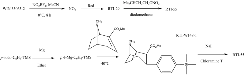 - ↑ Musachio JL, Keverline KI, Carroll FI, Dannals RF (January 1996). "3 Beta-(p-trimethylsilylphenyl)tropane-2 beta-carboxylic acid methyl ester: a new precursor for the preparation of [123I]RTI-55". Applied Radiation and Isotopes. 47 (1): 79–81. doi:10.1016/0969-8043(95)00259-6. PMID 8589674.