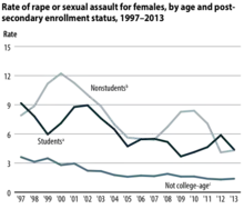 | Rape or sexual assault victimization against females ages 18 to 24, by post-secondary enrollment status, 1995–2013[62] | ||