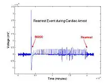 Rearrest (also known as refibrillation or recurrent ventricular fibrillation) is a phenomenon that involves the resumption of a lethal cardiac dysrhythmia after successful return of spontaneous circulation (ROSC) has been achieved during the course of resuscitation. Survival to hospital discharge rates are as low as 7% for cardiac arrest in general [1] and although treatable, rearrest may worsen these survival chances. Rearrest commonly occurs in the out-of-hospital setting under the treatment of health care providers.[2]
