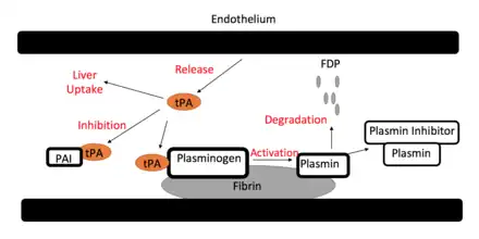 Once in the body, tPA has can cause the desired thrombolytic activity (see figure), or be inactivated and removed. In the bloodstream tPA has a half-life of 4 to 6 minutes.[39] tPA can be bound by a plasminogen activator inhibitor, resulting in inactivation of its activity. The protein is then removed from the bloodstream by the liver. One of the specific receptors responsible for this processes is a protein known as the LDL Receptor-Related Protein (LRP1), which clears tPA which is bound to the Plasminogen Activator Inhibitor 1 (PAI-1).[38] However, when present in a high enough concentration to counteract the effects of plasminogen activator inhibitor, tPA can bind plasminogen, cleaving off the bound plasmin from it. Plasmin, another type of protease, can either be bound by a plasmin inhibitor, or work to degrade fibrin clots, which is the main therapeutic pathway.[37]