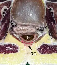 ![]() Transverse section through pelvic region of a Chinese female. The rectococcygeal muscle (RC) is indicated by arrow and outlined in red. Other features are the bladder (B), vagina (V), rectum (R) and gluteus maximus (GM). | |