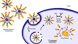- ↑ Sun, Huanli; Meng, Fenghua; Cheng, Ru; Deng, Chao; Zhong, Zhiyuan (2013-03-22). "Reduction-sensitive degradable micellar nanoparticles as smart and intuitive delivery systems for cancer chemotherapy". Expert Opinion on Drug Delivery. 10 (8): 1109–1122. doi:10.1517/17425247.2013.783009. ISSN 1742-5247. PMID 23517599. S2CID 22681173.