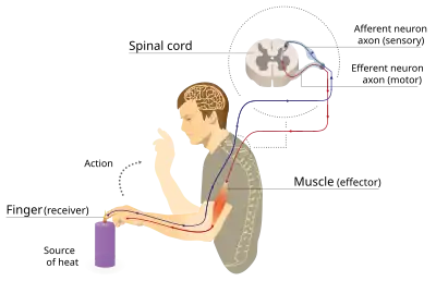 There are two types: autonomic reflex arc (affecting inner organs) and somatic reflex arc (affecting muscles). Autonomic reflexes sometimes involve the spinal cord and some somatic reflexes are mediated more by the brain than the spinal cord.[1]