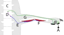 In a reflex arc, an action potential can bypass the brain for processing and uses dedicated neural pathways for faster processing. When a stimulus (A) is encountered, the signal from that stimulus will travel up the sensory neuron (B, in green) to the spinal column (C). There it will likely pass through a short interneuron (D, in purple) before continuing down a motor neuron (E, in blue) to the origin of the signal. Then, a contraction of the muscles (F, in red) is triggered, moving the bone (G).