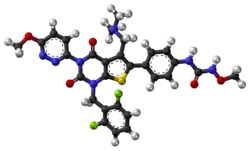 - 1 2 3 4 5 Miwa K, Hitaka T, Imada T, Sasaki S, Yoshimatsu M, Kusaka M, et al. (July 2011). "Discovery of 1-{4-[1-(2,6-difluorobenzyl)-5-[(dimethylamino)methyl]-3-(6-methoxypyridazin-3-yl)-2,4-dioxo-1,2,3,4-tetrahydrothieno[2,3-d]pyrimidin-6-yl]phenyl}-3-methoxyurea (TAK-385) as a potent, orally active, non-peptide antagonist of the human gonadotropin-releasing hormone receptor". Journal of Medicinal Chemistry. 54 (14): 4998–5012. doi:10.1021/jm200216q. PMID 21657270.