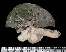 | Photo of liver and pancreas showing multiple cysts in the latter in a patient with renal–hepatic–pancreatic dysplasia | |