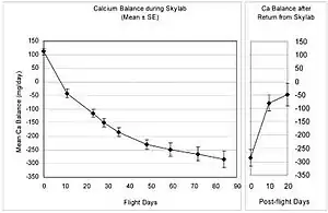 The Skylab missions were the first missions that extended past several days in duration. Testing during these missions showed that calcium excretion increased early in flight and almost exceeded the upper threshold for normal excretion.[15]
