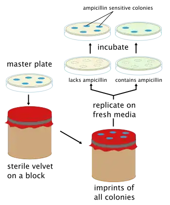 Replica plating is especially useful for "negative selection". However, it is more correct to refer to "negative screening" instead of using the term 'selection'. For example, if one wanted to select colonies that were sensitive to ampicillin, the primary plate could be replica plated on a secondary Amp+ agar plate. The sensitive colonies on the secondary plate would die but the colonies could still be deduced from the primary plate since the two have the same spatial patterns from ampicillin resistant colonies. The sensitive colonies could then be picked off from the primary plate. Frequently the last plate will be non-selective. In the figure, a nonselective plate will be replica plated after the Amp+ plate to confirm that the absence of growth on the selective plate is due to the selection itself and not a problem with transferring cells. If one sees growth on the third (nonselective) plate but not the second one, the selective agent is responsible for the lack of growth. If the non-selective plate shows no growth, one cannot say whether viable cells were transferred at all, and no conclusions can be made about the presence or absence of growth on selective media. This is particularly useful if there are questions about the age or viability of the cells on the original plate.