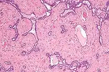Micrograph of the rete testis involved by seminoma. H&E stain.