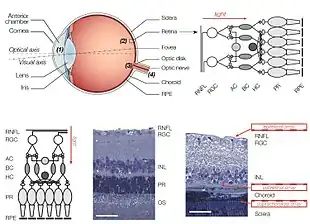 - ↑ Humayun MS, Dorn JD, da Cruz L, Dagnelie G, Sahel JA, Stanga PE, Cideciyan AV, Duncan JL, Eliott D, Filley E, Ho AC, Santos A, Safran AB, Arditi A, Del Priore LV, Greenberg RJ (2012). "Interim results from the international trial of Second Sight's visual prosthesis". Ophthalmology. 119 (4): 779–88. doi:10.1016/j.ophtha.2011.09.028. PMC 3319859. PMID 22244176.
