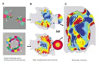 Retinotopy mapping in humans is done with functional magnetic resonance imaging (fMRI). The subject inside the fMRI machine focuses on a point. Then the retina is stimulated with a circular image or angled lines about the focus point.[23][24][25] The radial map displays the distance from the center of vision. The angular map shows angular location using rays angled about the center of vision. By combining the radial and angular maps, the separate regions of the visual cortex and the smaller maps in each region can be seen.