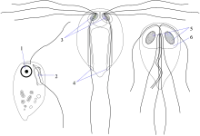 The retortamonads are a small group of flagellates, most commonly found in the intestines of animals as commensals, although a free-living species called the Chilomastix cuspidata exists. They are grouped under the taxon Archezoa.[1] They are usually around 5-20 μm in length, and all of their small subunit ribosomal RNA gene sequences are very similar to each other. There are two genera: Retortamonas with two flagella, and Chilomastix with four. In both cases there are four basal bodies anterior to a prominent feeding groove, and one flagellum is directed back through the cell, emerging from the groove.