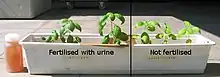 Applying urine as fertilizer has been called "closing the cycle of agricultural nutrient flows" or ecological sanitation or ecosan. Urine fertilizer is usually applied diluted with water because undiluted urine can chemically burn the leaves or roots of some plants, causing plant injury,[19] particularly if the soil moisture content is low. The dilution also helps to reduce odor development following application. When diluted with water (at a 1:5 ratio for container-grown annual crops with fresh growing medium each season or a 1:8 ratio for more general use), it can be applied directly to soil as a fertilizer.[20][21] The fertilization effect of urine has been found to be comparable to that of commercial nitrogen fertilizers.[22][23] Urine may contain pharmaceutical residues (environmental persistent pharmaceutical pollutants).[24] Concentrations of heavy metals such as lead, mercury, and cadmium, commonly found in sewage sludge, are much lower in urine.[25]