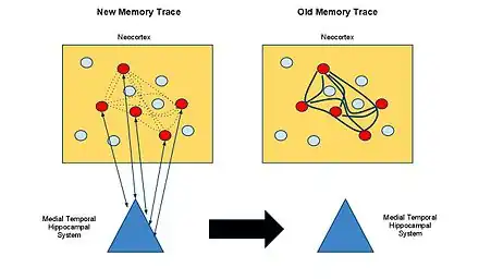 Initially proposed in 1984 by Larry Squire, Neal Cohen, and Lynn Nadel, the standard model of systems consolidation is a contemporary theory used to explain the cognitive processes behind Ribot's law. In the model, interaction between the medial temporal hippocampus (MTH) and multiple areas in the neocortex lead to the formation of a cortical trace which represents a single memory. While this MTH-neocortex interaction is initially required to maintain the memory trace, the model predicts that over time the importance of the MTH becomes diminished and eventually is unnecessary for the storage of the memory trace.[9] The medial temporal hippocampus mediates memory formation by maintaining the connections between various neocortical regions that make up each memory trace. At first the associations between neocortical areas that make up a newly formed memory trace are weak, however repeated activation of these areas in succession lead to "consolidation" of the trace within the neocortex. Once consolidation is sufficiently complete, the memory trace becomes mediated through neocortical activity alone and the MTH is no longer necessary for re-activation.