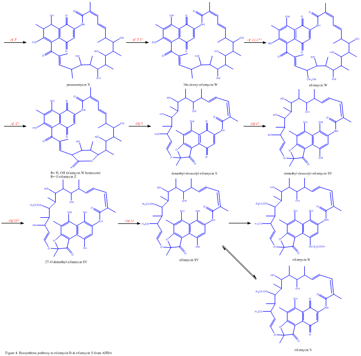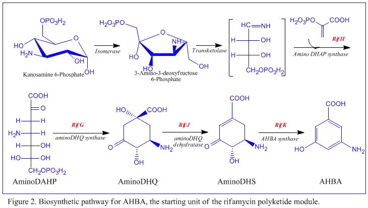 The first information on the biosynthesis of the rifamycins came from studies using the stable isotope Carbon-13 and NMR spectroscopy to establish the origin of the carbon skeleton. These studies showed that the ansa chain was derived from acetate and propionate, in common with other polyketide antibiotics. The naphthalenic chromophore was shown to derive from a propionate unit coupled with a seven carbon amino moiety of unknown origin. The general scheme of biosynthesis starts with the uncommon starting unit, 3-amino-5-hydroxybenzoic acid (AHBA), via type I polyketide pathway (PKS I) in which chain extension is performed using 2 acetate and 8 propionate units.[11] AHBA is believed to have originated from the Shikimate pathway, however this was not incorporated into the biosynthetic mechanism. This is due to the observation that 3 amino-acid analogues converted into AHBA in cell-free extracts of A. mediterranei.[12]