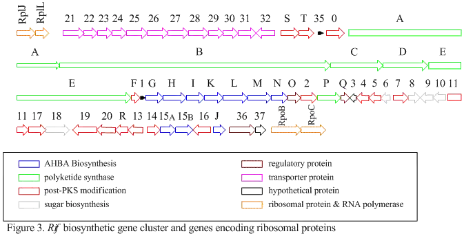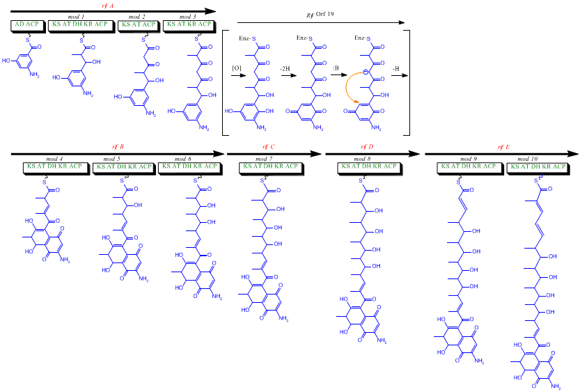 The rif cluster is responsible for the biosynthesis of rifamycins. It contains genes rifG through rifN, which were shown to biosynthesize AHBA.[10] RifK, rifL, rifM, and rifN are believed to act as transaminases in order to form the AHBA precursor kanosamine.[13][14] "RifH" encodes aminoDAHP synthase that catalyzes the condensation between 1-deoxy-1-imino-d-erythrose 4-phosphate and phosphoenolpyruvate.[15] RifA through rifE encode a type I polyketide synthase module, with the loading module being a non-ribosomal peptide synthetase. In all, rifA-E assemble a linear undecaketide and are followed by rifF, which encodes an amide synthase and causes the undecaketide to release and form a macrolactam structure. Moreover, the rif cluster contains various regulatory proteins and glycosylating genes that appear to be silent. Other types of genes seem to perform post-synthase modifications of the original polyketide.