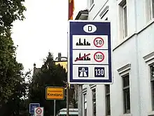 Speed limits in different areas; here unusually with only a "recommended" limit (Richtgeschwindigkeit) of 130 km/h on the Autobahn in Germany