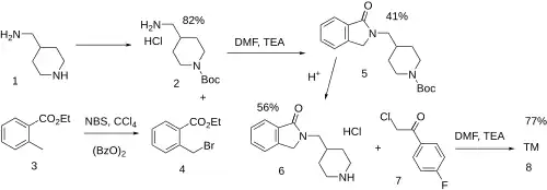 The Boc protection of 4-aminomethylpiperidine [7144-05-0] (1) gives tert-Butyl 4-aminomethylpiperidine-1-carboxylate hydrochloride [359629-16-6] (2). The free-radical halogenation of ethyl o-toluate [87-24-1] (3) led to ethyl 2-(bromomethyl)benzoate [7115-91-5] (4). The reaction between the two intermediates led to 2-[(1-tert-Butoxycarbonylpiperidin-4-yl)methyl]isoindolin-1-one [359629-19-9] (5). Deprotection yielded 2-(Piperidin-4-ylmethyl)-3H-isoindol-1-one;hydrochloride (6). Alkylation of the secondary nitrogen with 2-chloro-4'-fluoroacetophenone [700-35-6] (7) completed the synthesis of Roluperidone (8).