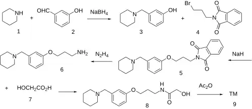 The reductive amination between piperidine [110-89-4] (1) and 3-hydroxybenzaldehyde [100-83-4] (2) gives 3-(1-Piperidinylmethyl)phenol [73279-04-6] (3). William ether synthesis with N-(3-Bromopropyl)phthalimide [5460-29-7] (4) gives PC12898565 (5). W.K. deprotection with hydrazine yielded (3-(1-piperidinylmethyl)phenoxy)propylamine [73278-98-5] (6). Heating with glycolic acid [79-14-1] (7) gave the amide (8). Acetylation with acetic anhydride completed the synthesis of (9).