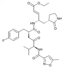 Rupintrivir (AG-7088, Rupinavir) is a peptidomimetic antiviral drug which acts as a 3C and 3CL protease inhibitor.[1][2][3] It was developed for the treatment of rhinoviruses,[4][5] and has subsequently been investigated for the treatment of other viral diseases including those caused by picornaviruses,[6][7] norovirus,[8] and coronaviruses, such as SARS and COVID-19.[9][10]