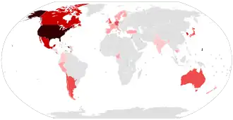 Epsilon (CAL.20C) was first observed in July 2020 by researchers at the Cedars-Sinai Medical Center, California, in one of 1,230 virus samples collected in Los Angeles County from the start of the COVID-19 epidemic.[1] It was not detected again until September when it reappeared among samples in California, but numbers remained very low until November.[8][9] In November 2020, the Epsilon variant accounted for 36 percent of samples collected at Cedars-Sinai Medical Center, and by January 2021, the Epsilon variant accounted for 50 percent of samples.[3] In a joint press release by University of California, San Francisco, California Department of Public Health, and Santa Clara County Public Health Department,[10] it was announced that the variant was also detected in multiple counties in Northern California. From November to December 2020, the frequency of the variant in sequenced cases from Northern California rose from 3% to 25%.[11] A preprint describes CAL.20C as belonging to Nextstrain clade 20C and contributing approximately 36% of samples, while an emerging variant from the 20G clade accounts for some 24% of the samples in a study focused on Southern California. However, in the US as a whole, the 20G clade predominated as of January 2021. Following the increasing numbers of Epsilon in California, the variant has been detected at varying frequencies in most US states. Small numbers have been detected in other countries in North America, and in Europe, Asia and Australia.[8][9] As of July 2021, the Epsilon variant had been detected in 45 countries, according to GISAID.[12] After an initial increase, its frequency rapidly decreased from February 2021 as it was being outcompeted by the more transmissible Alpha variant. In April, Epsilon remained relatively frequent in parts of northern California, but it had virtually disappeared from the south of the state and had never been able to establish itself elsewhere; only 3.2% of all cases in the United States were Epsilon, whereas by then more than two-thirds were Alpha.[13]