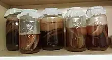 Symbiotic culture of bacteria and yeast (SCOBY) is a culinary symbiotic fermentation culture (starter) consisting of lactic acid bacteria (LAB), acetic acid bacteria (AAB), and yeast which arises in the preparation of sour foods and beverages such as kombucha.[1] Beer and wine also undergo fermentation with yeast, but the lactic acid bacteria and acetic acid bacteria components unique to SCOBY are usually viewed as a source of spoilage rather than a desired addition.[2][3] Both LAB and AAB enter on the surface of barley and malt in beer fermentation and grapes in wine fermentation; LAB lowers the pH of the beer/wine while AAB takes the ethanol produced from the yeast and oxidizes it further into vinegar, resulting in a sour taste and smell.[2][3] AAB are also responsible for the formation of the cellulose SCOBY.[1]