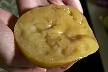 In its most common form, SCOBY is a gelatinous, cellulose-based biofilm or microbial mat found floating at the container's air-liquid interface. This bacterial cellulose mat is sometimes called a pellicle.[4] SCOBY pellicles, like sourdough starters, can serve the purpose of continuing the fermentation process into a new vessel and reproducing the desired product.[4] This can be attributed to SCOBY's ability to house not only the symbiotic growth, but a small amount of the previous media and product due to its ability to absorb water.[1] SCOBYs can vary greatly in cell density within the biofilm due to fermentation conditions, leading to possible variations in the end product; numerous studies are currently taking place to determine the optimal ratio of SCOBY, if any, to liquid culture to ensure highest product consistency, as there are no standard operating procedures in place.[4] Further information such as the organisms and culture conditions necessary to ferment and form a SCOBY, biofilm characteristics, and applications in foods and beverages with specific emphasis in kombucha can be found below.[5]
