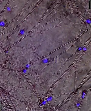 The cells typically grow in tissue culture in two distinct ways. Some grow into clumps of cells which float in the media, while others form clumps which stick to the dish. SH-SY5Y cells can spontaneously interconvert between two phenotypes in vitro, the neuroblast-like cells and the Epithelial like cells, although the mechanisms underlying this process are not understood.[3] However, the cell line is appreciated to be N-type (neuronal), given its morphology and the ability to differentiate the cells into along the neuronal lineage (in contrast to the S-type SH-EP subcloned cell line, also derived from SK-N-SH).[4] Cells with short spiny neurite-like processes migrate out from these adherent clumps. SH-SY5Y cells possess an abnormal chromosome 1, where there is an additional copy of a 1q segment and is referred to trisomy 1q. SH-SY5Y cells are known to be dopamine beta hydroxylase active, acetylcholinergic, glutamatergic and adenosinergic. The cells have very different growth phases, outlined in the surrounding pictures. The cells both propagate via mitosis and differentiate by extending neurites to the surrounding area. While dividing, the aggregated cells can look so different from the differentiated cells following the K'annul-index tumor cellularity (TNF, for Tumor Necrosis Factor), that new scientists often mistake one or the other for contamination. The dividing cells can form clusters of cells which are reminders of their cancerous nature.
