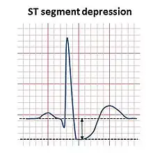 ST depression refers to a finding on an electrocardiogram,[1][2] wherein the trace in the ST segment is abnormally low below the baseline.
