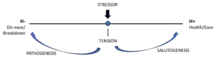"Salutogenesis describes how social and individual resources help people to manage stress and to thrive. Salutogenesis focuses attention on the study of the origins (genesis) of health (salus) and of positive health outcomes—moving towards the positive end of an ease/dis-ease continuum—in contrast to the more usual study of the origins of disease and risk factors (pathogenesis). Salutogenesis emphasizes the importance of sense of coherence—an individual or collective orientation towards life as being comprehensible, manageable, and meaningful. In health promotion, the salutogenic approach focuses on strengthening resources and assets that help people to cope with adversarial life situations, promote wellbeing and thriving."[10]