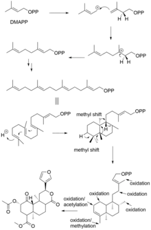 Subsequent addition of three 5-carbon IPP units to a single 5-carbon DMAPP unit generates the 20-carbon central precursor, geranylgeranyl diphosphate (GGPP). Bicyclization of GGPP by the class II diterpene synthase, ent-clerodienyl diphosphate synthase (SdCPS2[32]), produces a labdanyl diphosphate carbocation, which is subsequently rearranged through a sequence of 1,2-hydride and methyl shifts to form the ent-clerodienyl diphosphate intermediate.[33] SdCPS2 catalyzes the first committed reaction in the biosynthesis of salvinorin A by producing its characteristic clerodane scaffold. A series of oxygenation, acylation and methylation reactions is then required to complete the biosynthesis of salvinorin A.[32]