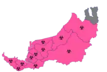 Since the first case was reported in Serian Division, further eight divisions including Betong, Kapit, Kuching, Miri, Samarahan, Sarikei, Sibu and Sri Aman have been declared as rabies infected areas.[23] One of the main causes of the spread to other divisions is resulted from an irresponsible dog owner taking a dog out from a rabies-infected area without movement permit from the state veterinary authority as discovered in late 2018 with a case of man who brought his dog to Limbang Division from Kuching.[24] From 1 July 2018 until 30 May 2019, the Sarawak government had declared 62 areas in 11 divisions as rabies infection areas with only Limbang Division free from the virus.[25][26]